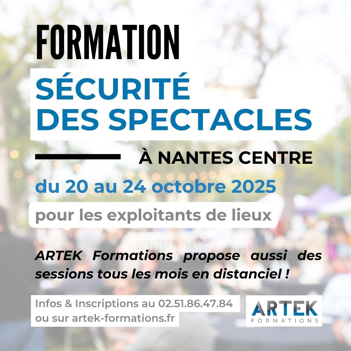 Exploitants de lieux, ARTEK Formations propose toute l'année des formations à la sécurité des spectacles en présentiel à Nantes (centre, à proximité de la gare). La prochaine est prévue du 20 au 24 octobre et il reste quelques places.