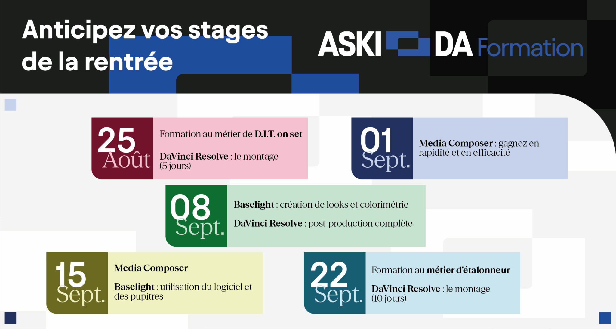 Notre organisme de formation sera en congés du 4 au 17 août 2025. Nous restons disponibles jusqu’au 1er août et dès le 18 août pour répondre à toutes vos demandes de formation. Voici une sélection de stages pour les intermittents qui débuteront entre le 25/08 et le 22/09, sur DaVinci Resolve, Media Composer, Baselight et le métier de DIT on set! Inscrivez-vous dès aujourd’hui en tenant compte des délais de dépôt des demandes de prise en charges AFDAS.