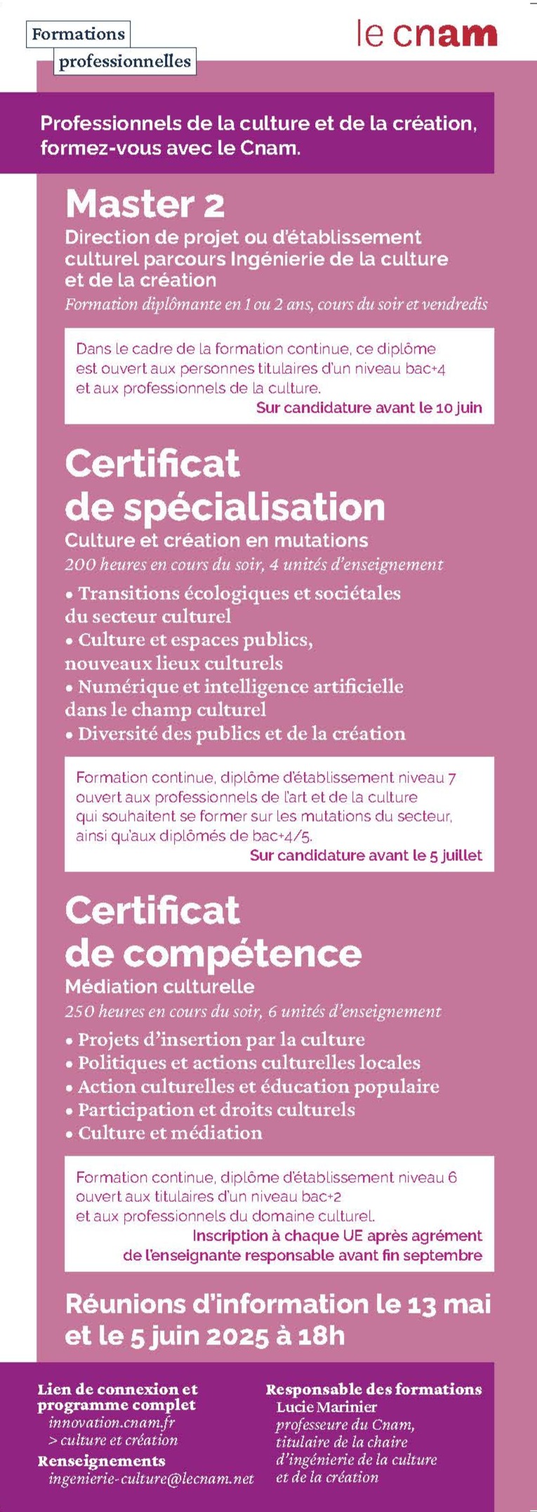 Ces formations s’adressent aux professionnels de la culture, artistes et professionnels travaillant avec les acteurs du patrimoine et de la création.