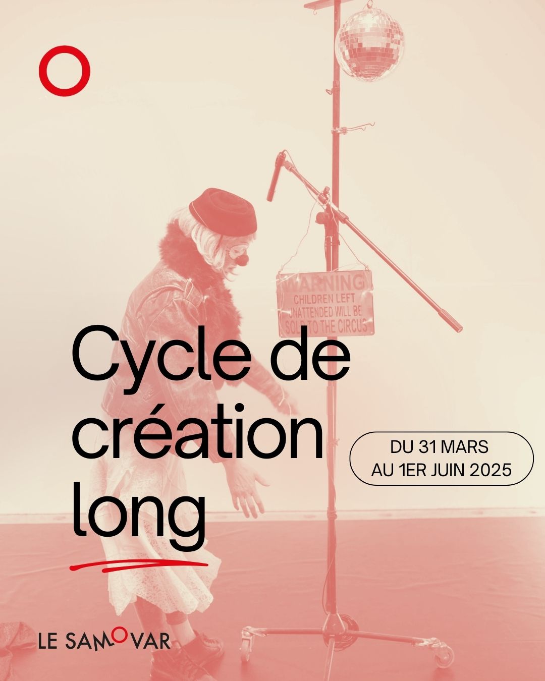 Le cycle de création long se déroule en 7 semaines, en 4 temps, du 31 mars au 1er juin 2025. Les sorties de cycle se feront à la fin du cycle, le vendredi, samedi et dimanche. Il aura lieu au Tapis vert dans l’Orne à 20 minutes d’Alençon, au Hangar d’inEX-, Taison (près de Saumur) et, bien sûr, au Samovar, Bagnolet (Île-de-France).