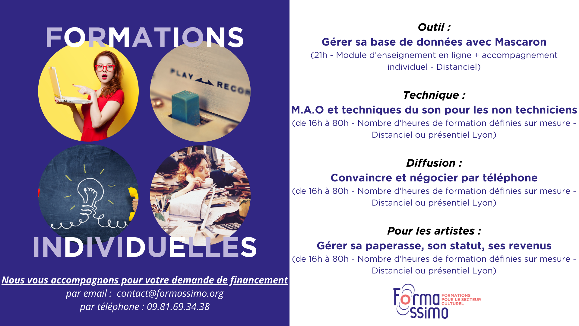 UN PROJET SINGULIER AU SERVICE DE LA FORMATION DES ACTEURS DU SECTEUR CULTUREL Formassimo est un organisme de formation professionnelle basé à Lyon dans le quartier de la Guillotière. L’équipe de Formassimo, à travers son expérience avec la Cie Antiquarks et ses échanges au sein du secteur des musiques… Lire la suite