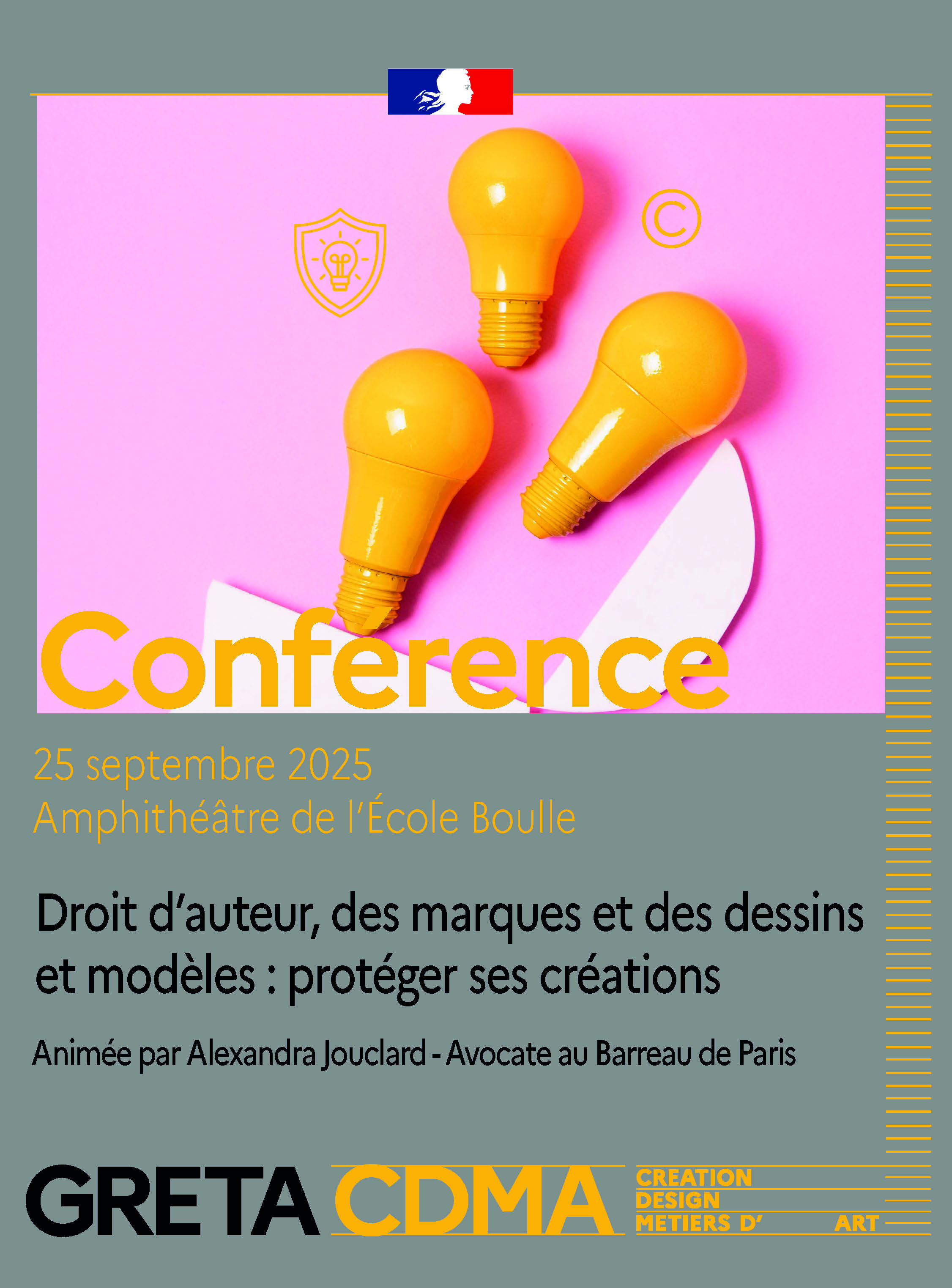 Cette conférence a pour objectif de présenter les principes essentiels du droit d’auteur, des marques et des dessins et modèles, en s’appuyant sur les principales réglementations et décisions qui fondent les droits qui concernent un créateur. Après un éclairage sur les enjeux de l’IA et de la réglementation européenne, sera détaillé les principes essentiels du droit d'auteur : l'originalité, l'œuvre, les droits patrimoniaux et moraux et la contrefaçon ainsi que les principes essentiels du droit des marques et du droit des dessins et modèles : les critères de protection.