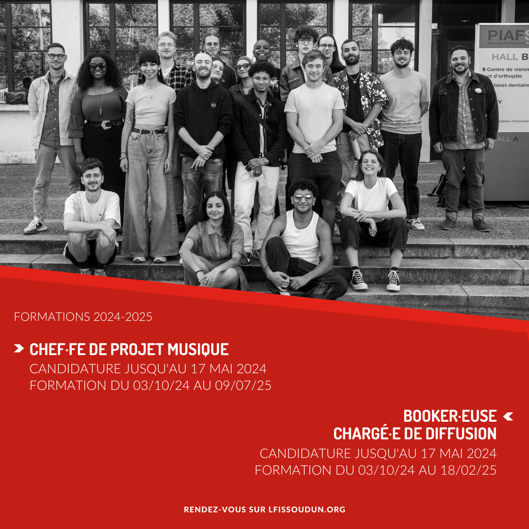 Vous avez jusqu'au 17 mai 2024 pour candidater à nos formations chef·fe de projet musique et booker·euse/chargé·e de diffusion